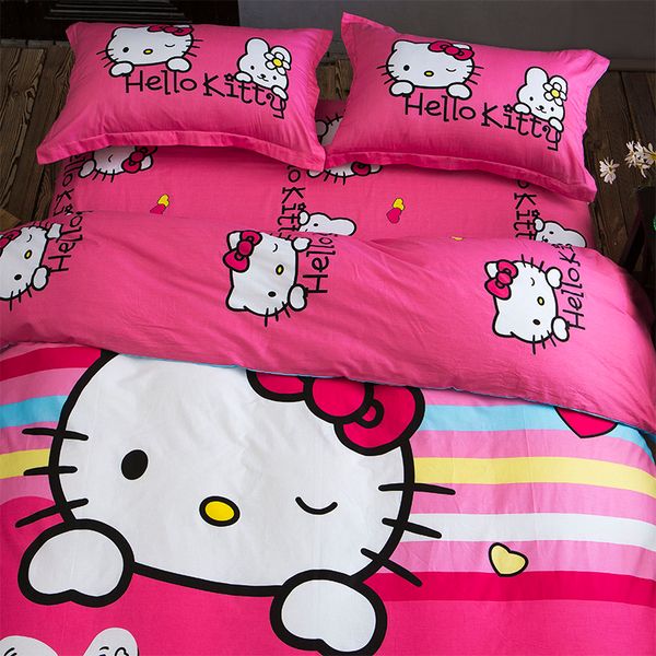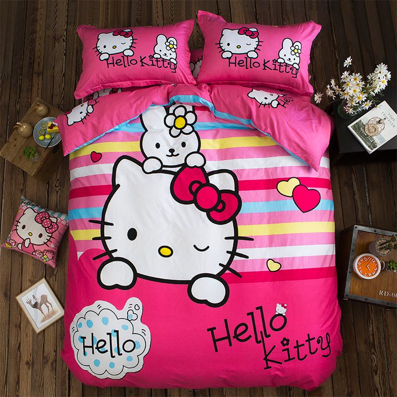 Pink Stripe Cartoon Bedding Sets Hello Kitty Princesses Twin Queen
