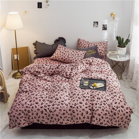 Pink Cotton Duvet Cover Stylish Bedding Set With Leopard Etsy