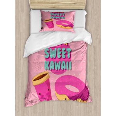 Anime Twin Size Duvet Cover Set Sweet Kawaii Lettering With Donut