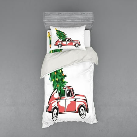 Christmas Duvet Cover Set Retro Classic Red Car Carrying Big Xmas