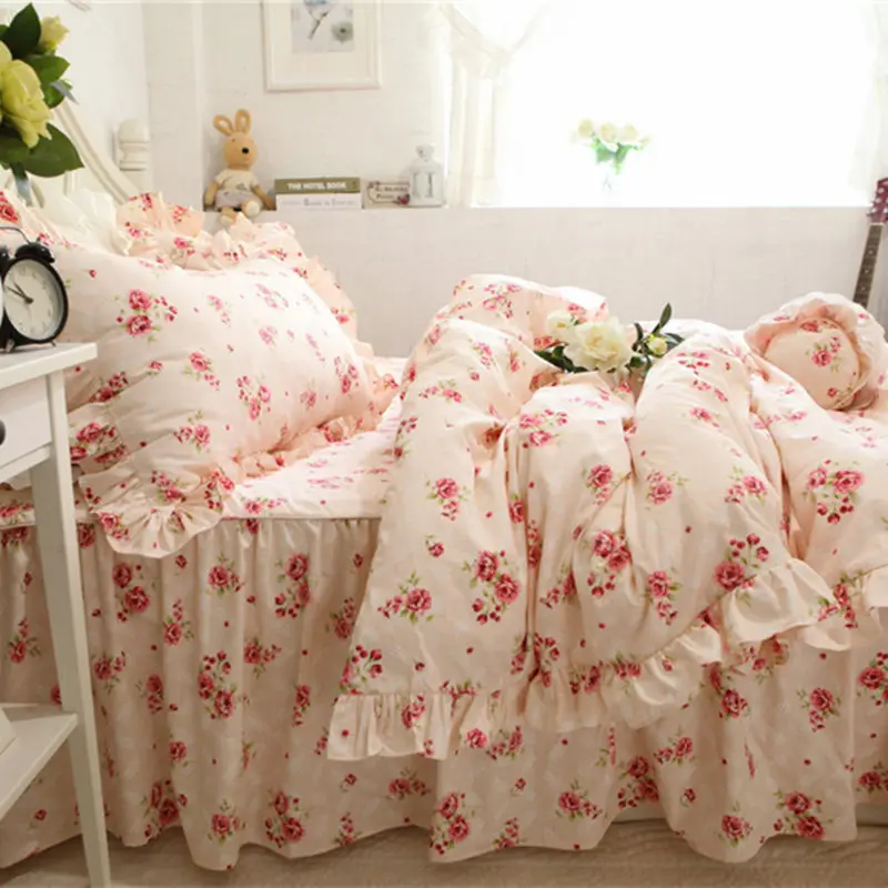 New European Style Bedding Set Red Rose Print Bedding Ruffle Duvet